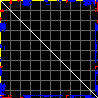 This matrix displays the maximum distance fluctuations between all pairs of CA atoms and between the two extreme conformations that were computed for this mode (DQMIN/DQMAX). Distance increases are plotted in blue and decreases in red for the strongest 10% of the residue pair distance changes. Every pixel corresponds to a single residue. Grey lines are drawn every 10 residues, yellow lines every 100 residues (counting from the upper left corner).