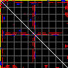 This matrix displays the maximum distance fluctuations between all pairs of CA atoms and between the two extreme conformations that were computed for this mode (DQMIN/DQMAX). Distance increases are plotted in blue and decreases in red for the strongest 10% of the residue pair distance changes. Every pixel corresponds to a single residue. Grey lines are drawn every 10 residues, yellow lines every 100 residues (counting from the upper left corner).