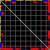 This matrix displays the maximum distance fluctuations between all pairs of CA atoms and between the two extreme conformations that were computed for this mode (DQMIN/DQMAX). Distance increases are plotted in blue and decreases in red for the strongest 10% of the residue pair distance changes. Every pixel corresponds to a single residue. Grey lines are drawn every 10 residues, yellow lines every 100 residues (counting from the upper left corner).