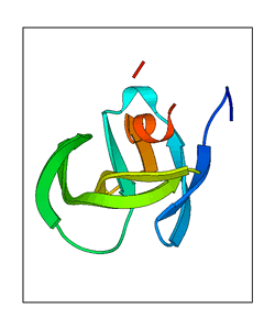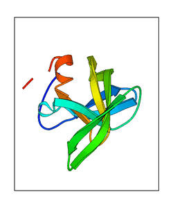 These views are prepared from three orthologuous viewpoints with MolScript. Secondary structures are determined from the C-alpha atom positions of your protein (N-terminal blue, C-terminal red).