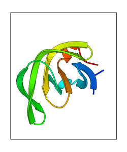 These views are prepared from three orthologuous viewpoints with MolScript. Secondary structures are determined from the C-alpha atom positions of your protein (N-terminal blue, C-terminal red).