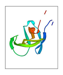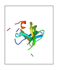 These views are prepared from three orthologuous viewpoints with MolScript. Secondary structures are determined from the C-alpha atom positions of your protein (N-terminal blue, C-terminal red).