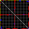 This matrix displays the maximum distance fluctuations between all pairs of CA atoms and between the two extreme conformations that were computed for this mode (DQMIN/DQMAX). Distance increases are plotted in blue and decreases in red for the strongest 10% of the residue pair distance changes. Every pixel corresponds to a single residue. Grey lines are drawn every 10 residues, yellow lines every 100 residues (counting from the upper left corner).