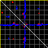 This matrix displays the maximum distance fluctuations between all pairs of CA atoms and between the two extreme conformations that were computed for this mode (DQMIN/DQMAX). Distance increases are plotted in blue and decreases in red for the strongest 10% of the residue pair distance changes. Every pixel corresponds to a single residue. Grey lines are drawn every 10 residues, yellow lines every 100 residues (counting from the upper left corner).