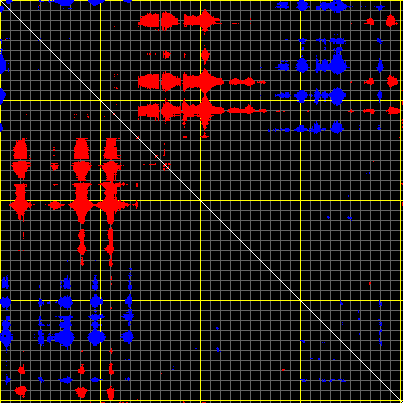 This matrix displays the maximum distance fluctuations between all pairs of CA atoms and between the two extreme conformations that were computed for this mode (DQMIN/DQMAX). Distance increases are plotted in blue and decreases in red for the strongest 10% of the residue pair distance changes. Every pixel corresponds to a single residue. Grey lines are drawn every 10 residues, yellow lines every 100 residues (counting from the upper left corner).